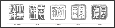 “北京精神”印章作品共有五方,分別是“北京精神”、“愛國”、“創(chuàng)新”、“包容”、“厚德”。