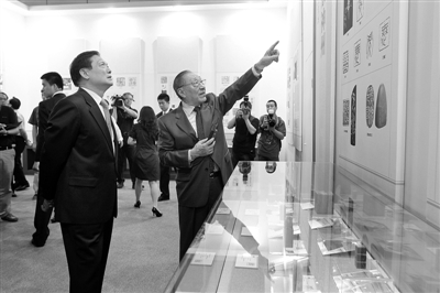劉淇同志與李嵐清一起觀看篆刻書法素描藝術(shù)展